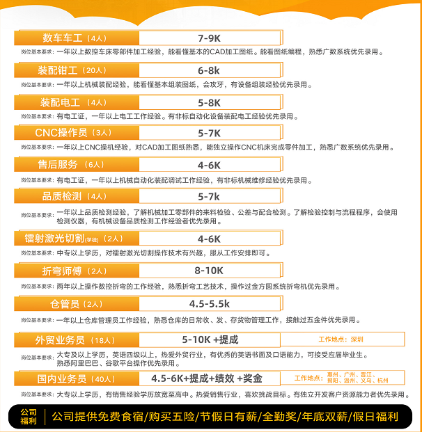 公司福利:工作環(huán)境優(yōu)美/提供免費食宿/五險/節(jié)假日有薪/全勤獎/年底雙薪/假日福利。