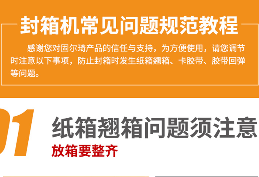 感謝您對固爾琦產(chǎn)品的信任與支持,為了方便使用,請您調(diào)節(jié)時注意一下事項,防止封箱時發(fā)生紙箱翹箱、卡膠帶、膠帶回彈等問題。