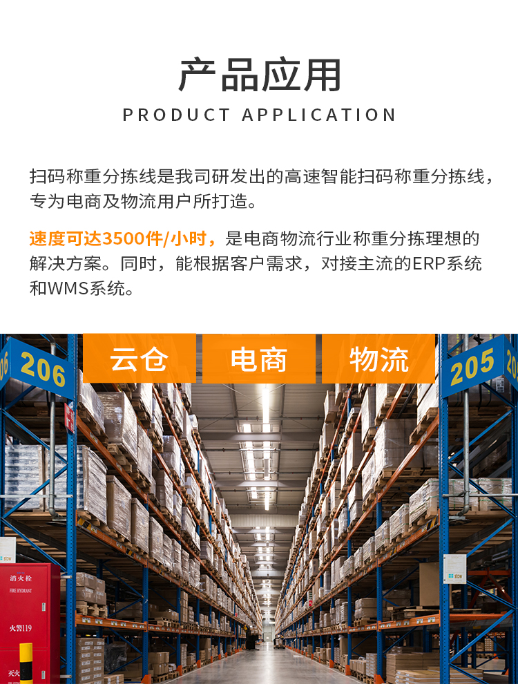 本產(chǎn)品是我司研發(fā)出的高速智能掃碼稱重分揀線,專為電商及物流用戶所打造。全線以高性能掃碼相機(jī),高速稱重機(jī)及擺輪分揀機(jī)為核心,集自動(dòng)掃碼,自動(dòng)稱重,自動(dòng)分揀,自動(dòng)攬收,錯(cuò)件自動(dòng)剔除等功能于一體。速度可達(dá)3500件/小時(shí)。是電商物流行業(yè)稱重分揀理想的解決方案。同時(shí),能根據(jù)客戶需求,對(duì)接主流的ERP系統(tǒng)和WMS系統(tǒng)。
