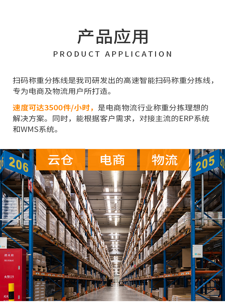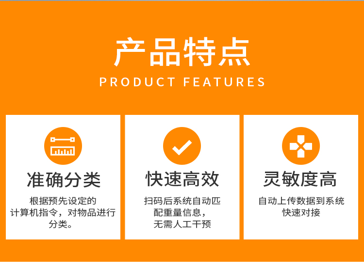 本產(chǎn)品是我司研發(fā)出的高速智能掃碼稱重分揀線,專為電商及物流用戶所打造。全線以高性能掃碼相機(jī),高速稱重機(jī)及擺輪分揀機(jī)為核心,集自動(dòng)掃碼,自動(dòng)稱重,自動(dòng)分揀,自動(dòng)攬收,錯(cuò)件自動(dòng)剔除等功能于一體。速度可達(dá)3500件/小時(shí)。是電商物流行業(yè)稱重分揀理想的解決方案。同時(shí),能根據(jù)客戶需求,對(duì)接主流的ERP系統(tǒng)和WMS系統(tǒng)。