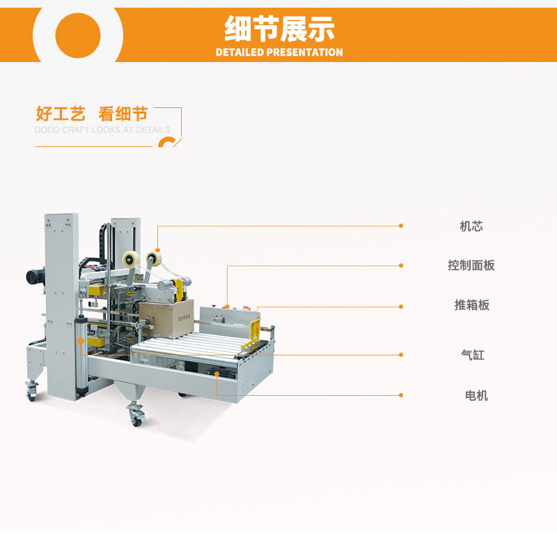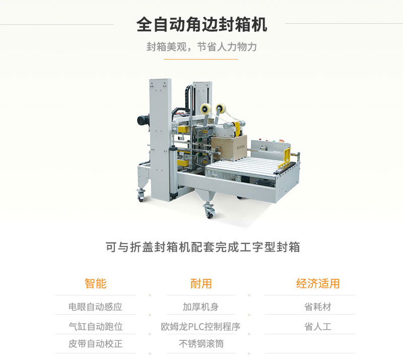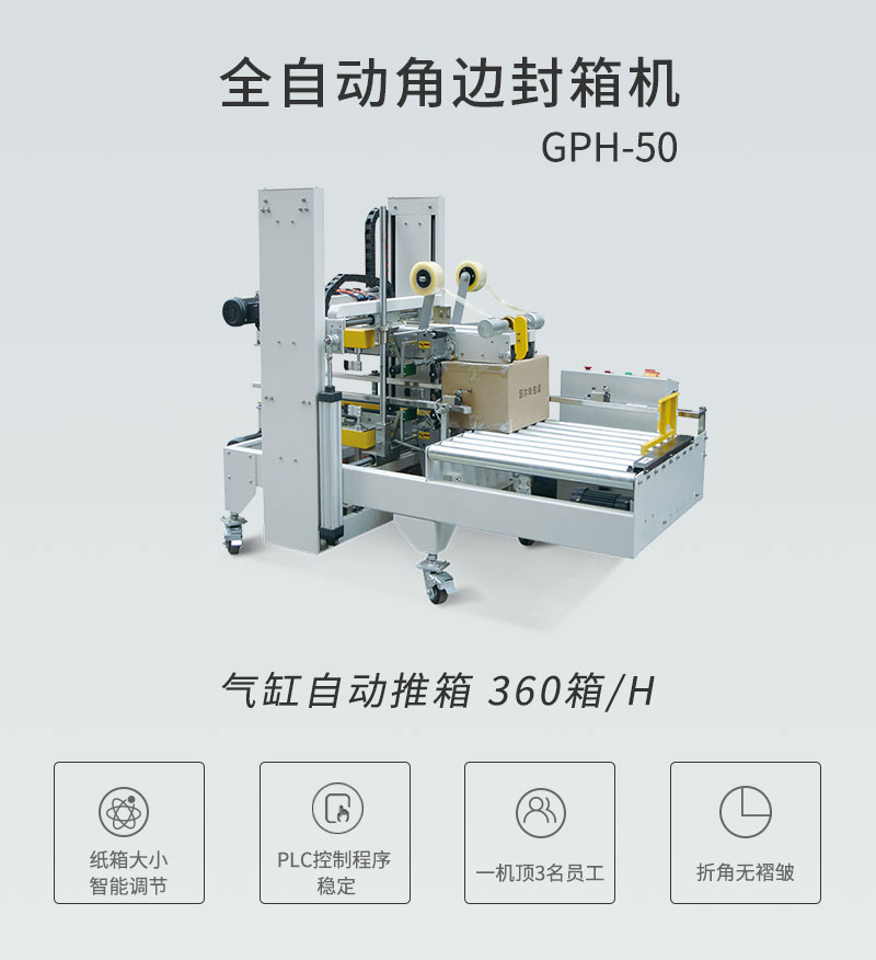 全自動(dòng)角邊封箱機(jī)GPH-655,經(jīng)前段一字形封箱機(jī)封合中線一字形后,通過L型轉(zhuǎn)角推送,輸送進(jìn)紙箱進(jìn)行四角邊封箱作業(yè)。智能調(diào)節(jié)紙箱尺寸,電眼自動(dòng)感應(yīng)、氣缸自動(dòng)跑位,上下驅(qū)動(dòng)皮帶自動(dòng)校正、輸送紙箱,封箱時(shí)快速平穩(wěn),折角無褶皺,適用于各類型紙箱。該款封箱機(jī)廣泛應(yīng)用于食品、醫(yī)藥、飲料、日化、電子等行業(yè)。