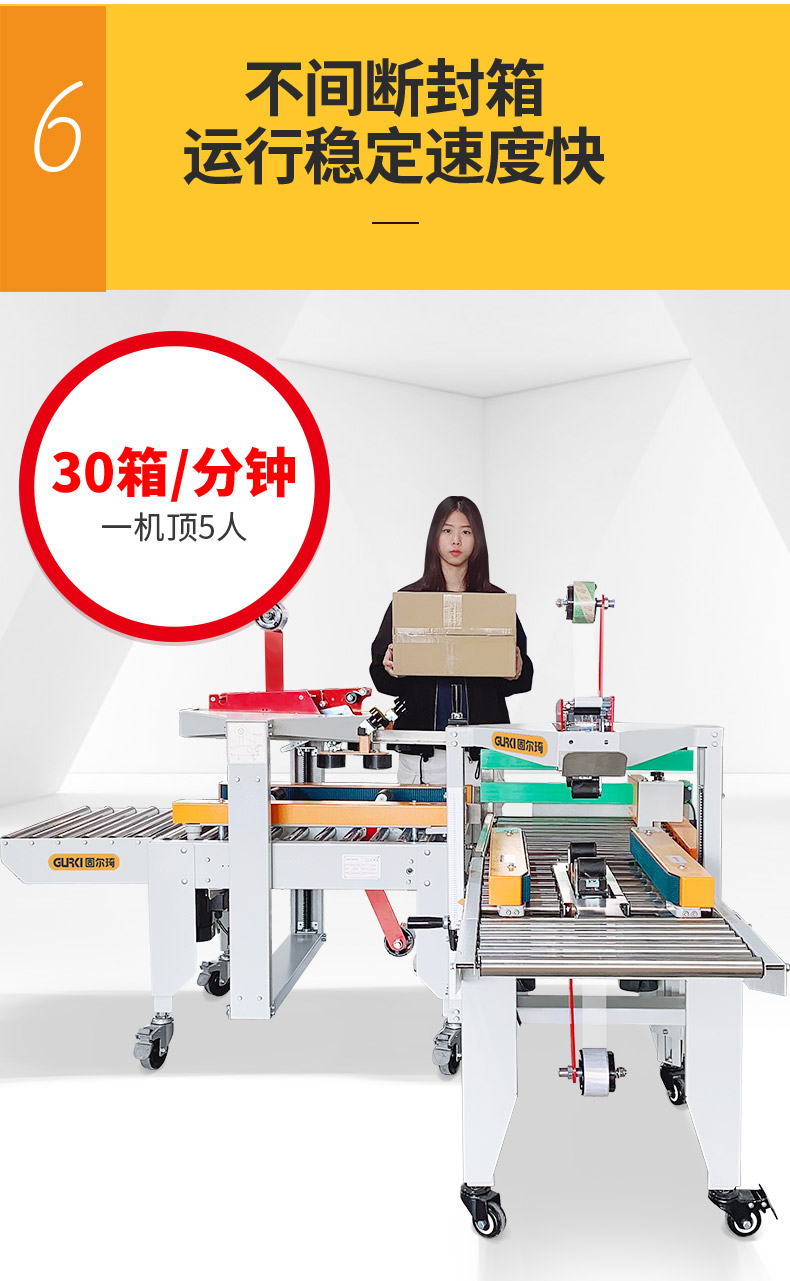 電商封箱機(jī)配套快遞貼面單機(jī),封箱貼面單效率日發(fā)8000+。具備一鍵式傻瓜操作,自動(dòng)化封箱貼面單一步完成,保養(yǎng)簡(jiǎn)單,穩(wěn)定性強(qiáng)的特點(diǎn)