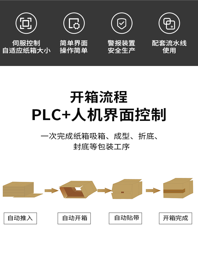 高速開箱機GPK-40H50是本公司自主生產(chǎn)設計的產(chǎn)品,臥式開箱速度達到50箱/分鐘的高速開箱機,高性價比配置,使用壽命長,經(jīng)濟實惠。 該款開箱機廣泛應用于食品、醫(yī)藥、飲料、煙草、日化、電子等各行業(yè)。