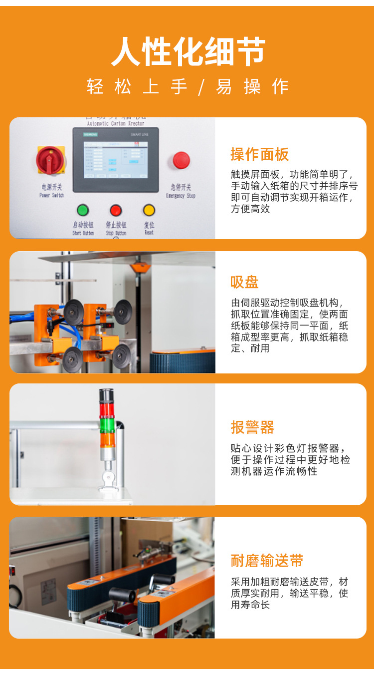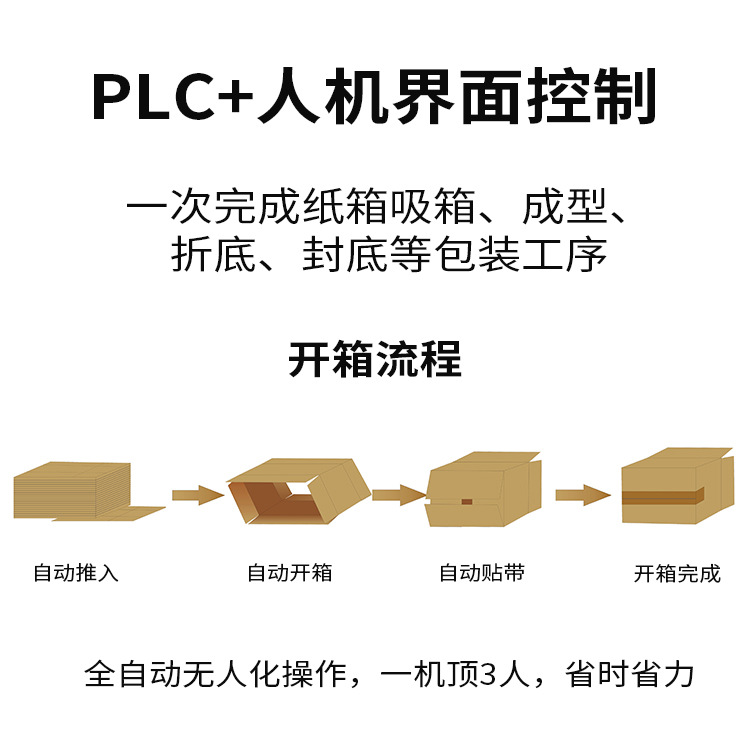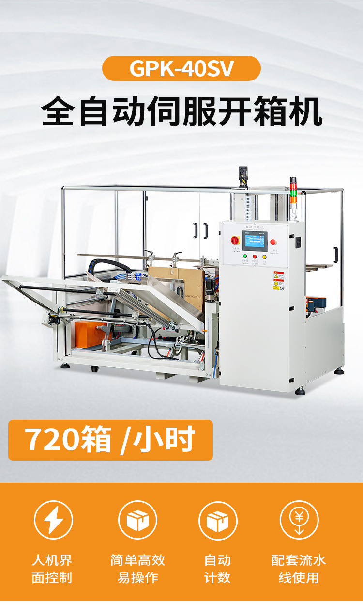 全自動伺服開箱機(jī)是一款支持多種規(guī)格開箱設(shè)備,設(shè)置立式料槽,儲料更多,大大節(jié)省了紙箱更換調(diào)節(jié)問題;整機(jī)采用電眼自動感應(yīng)、伺服控制和驅(qū)動設(shè)計(jì),開箱速度更快更穩(wěn),加裝安全防護(hù)門,開門即可換膠帶,更方便,省心;同時(shí),整機(jī)采用嚴(yán)格的生產(chǎn)工藝零部件和伺服驅(qū)動開箱,速度達(dá)12箱/分鐘,自動吸取紙箱并成型,并加裝了斷膠帶、無膠帶自動報(bào)警提示功能,該款開箱機(jī)已廣泛用于食品、醫(yī)藥、飲料、煙草、日化、電子等各行業(yè)。