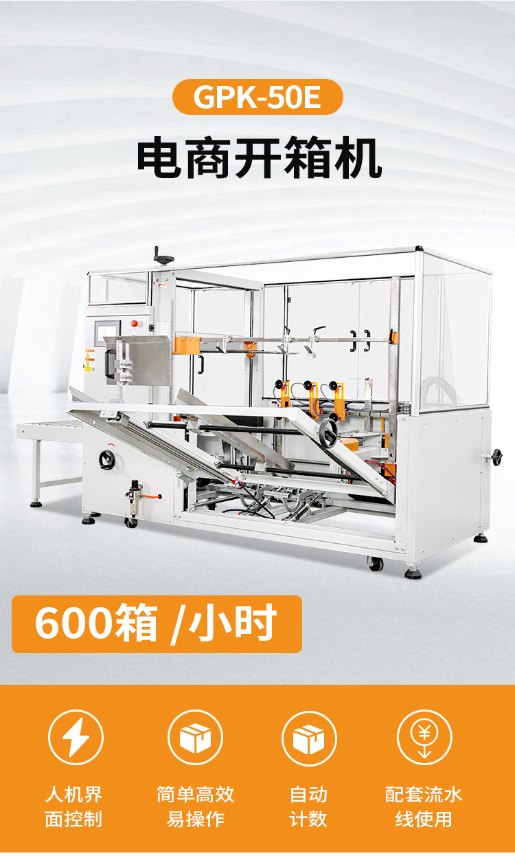 自動開箱機(jī)GPK-50E是自動將疊成紙板的箱板自動打開、箱子底部按程序自動折合成形、下底折葉折曲,并用膠帶密封后輸送給裝箱機(jī)的專用設(shè)備,機(jī)器采用PLC+人機(jī)界面控制,折底不停留,輸送中自動完成折底、封底;同時完成吸箱、成型、折底、封底整個過程。操作方便、維修簡單、性能穩(wěn)定。該款開箱機(jī)已廣泛用于食品、醫(yī)藥、飲料、煙草、日化、電子等各行業(yè)。
