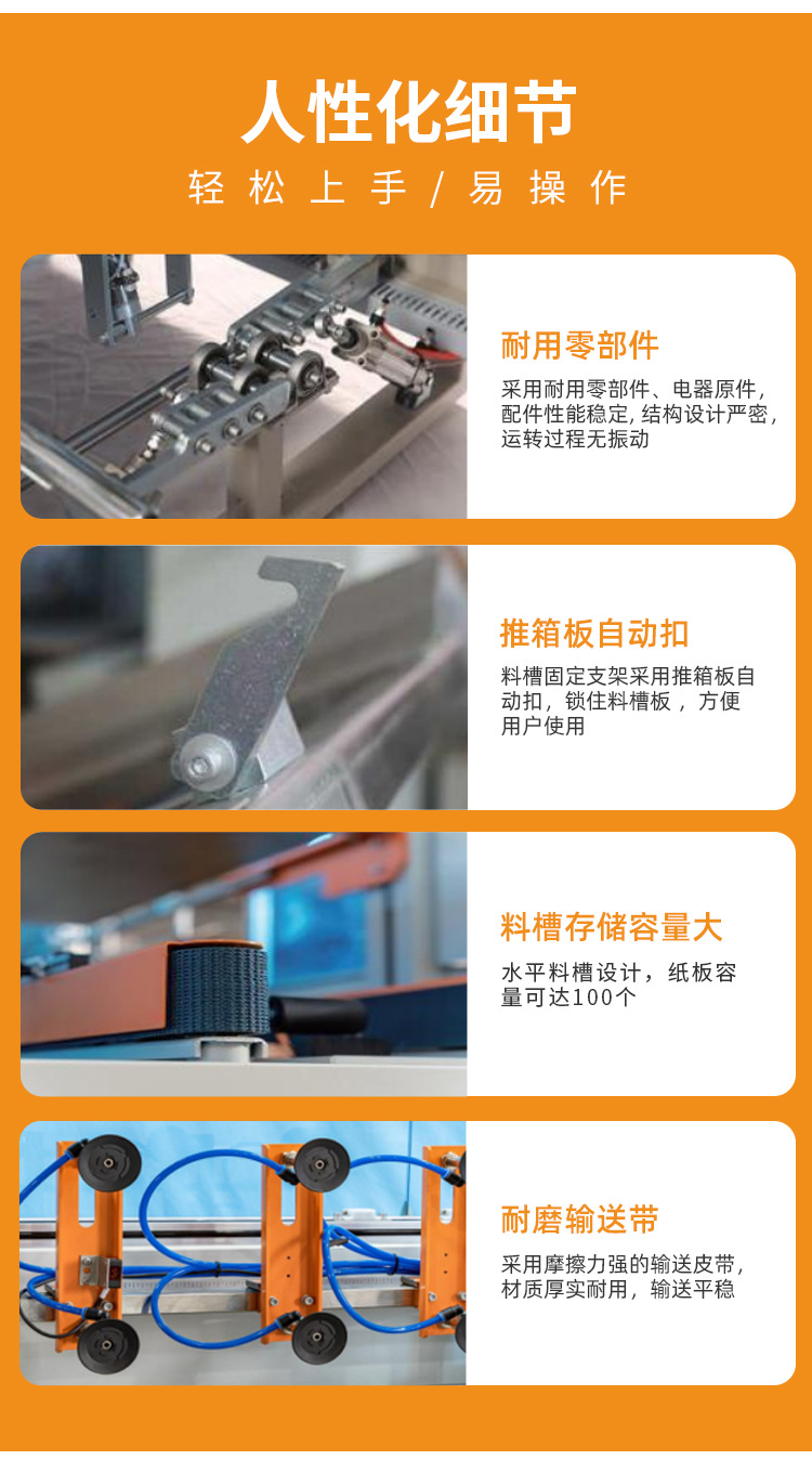 自動(dòng)開(kāi)箱機(jī)改變傳統(tǒng)料槽設(shè)計(jì),采用耐用零部件、電器原件,配件性能穩(wěn)定,結(jié)構(gòu)設(shè)計(jì)嚴(yán)密,運(yùn)轉(zhuǎn)過(guò)程無(wú)振動(dòng),用水平料槽設(shè)計(jì),紙板容量可達(dá)100個(gè),同時(shí),加大開(kāi)箱設(shè)計(jì),可開(kāi)紙箱長(zhǎng)達(dá)80cm,封箱折底一次完成,廣泛用于食品、醫(yī)藥、飲料、煙草、日化、電子等各行業(yè)。