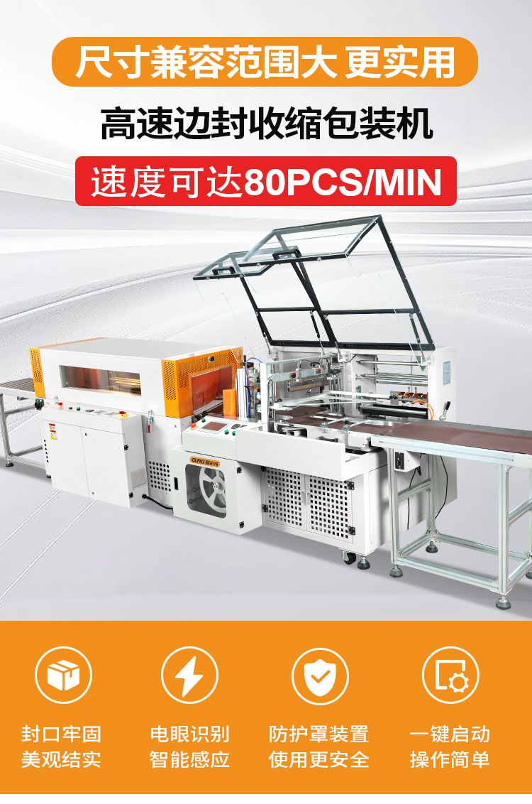 全自動高速邊封收縮包裝機(jī)是用于對產(chǎn)品進(jìn)行全自動在線高速收縮包裝,采用光電對產(chǎn)品進(jìn)行自動偵測,包裝能力為每分鐘85包,適合包裝 各類型不同大小及形狀的產(chǎn)品。觸屏控制機(jī)器,調(diào)節(jié)方便簡單,同時(shí)可儲存多種產(chǎn)品包裝數(shù)據(jù),使用時(shí)可直接從系統(tǒng)中調(diào)出,方便快捷,大大縮短更換包裝產(chǎn)品時(shí)所需的時(shí)間。該款收縮包裝機(jī)廣泛用于批量生產(chǎn)包裝的流水作業(yè),印刷、彩盒、賀卡、相冊、相框、醫(yī)藥、電子、日 化、化妝品、汽配、五金、食品等大批量生產(chǎn)的行業(yè)。
