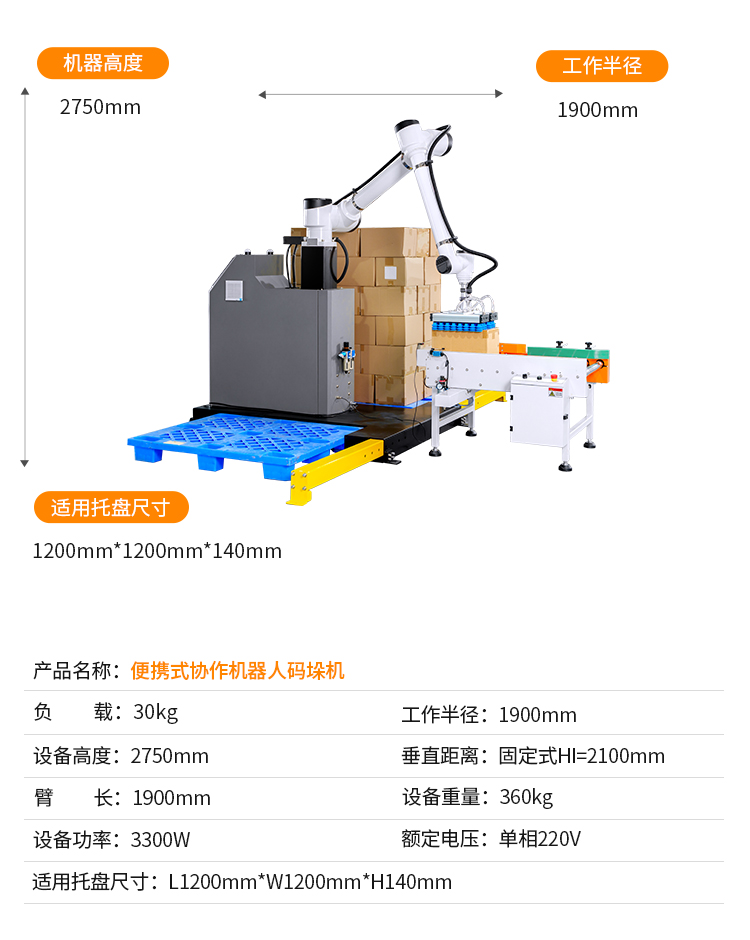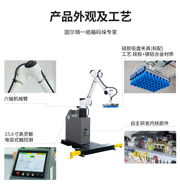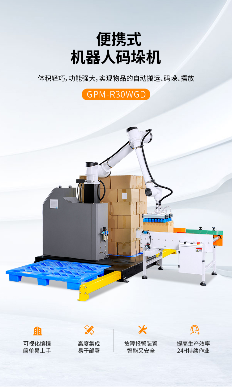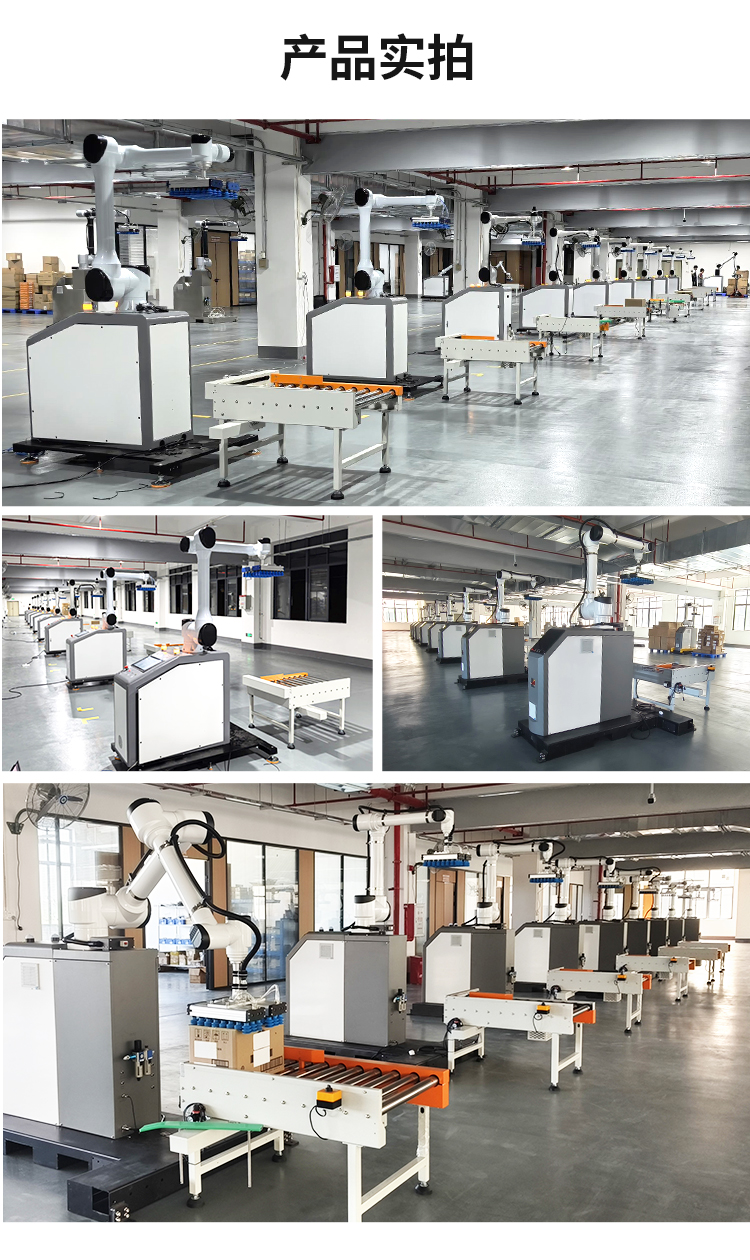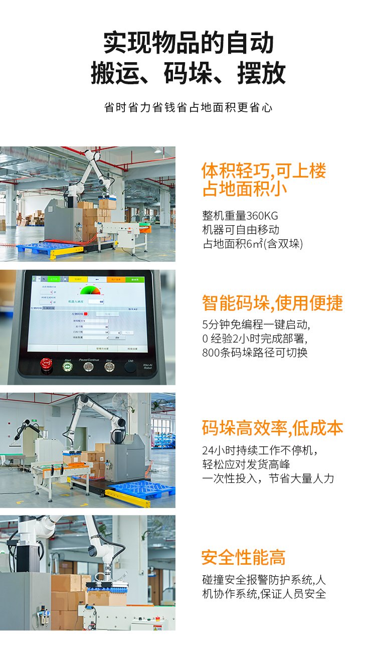 協(xié)作機(jī)器人碼垛,與人類工作人員緊密合作,提高生產(chǎn)效率、靈活適應(yīng)不同任務(wù)。安全配備傳感器,為工作人員創(chuàng)造更安全高效的工作環(huán)境,外形精巧美觀,調(diào)整方便簡單,本設(shè)備采用觸控屏操作,實現(xiàn)智能化操作管理,簡便、易掌握,可大大地減少勞動人員和降低勞動強(qiáng)度??瑟毩⑹褂靡部膳涮鬃詣庸C(jī)和棧板輸送機(jī)來實現(xiàn)全自動碼垛系統(tǒng),廣泛應(yīng)用于多個行業(yè)的碼垛工序,如紙箱類、醫(yī)藥類、日用品、食品、飲料、化妝品、金屬制品等。