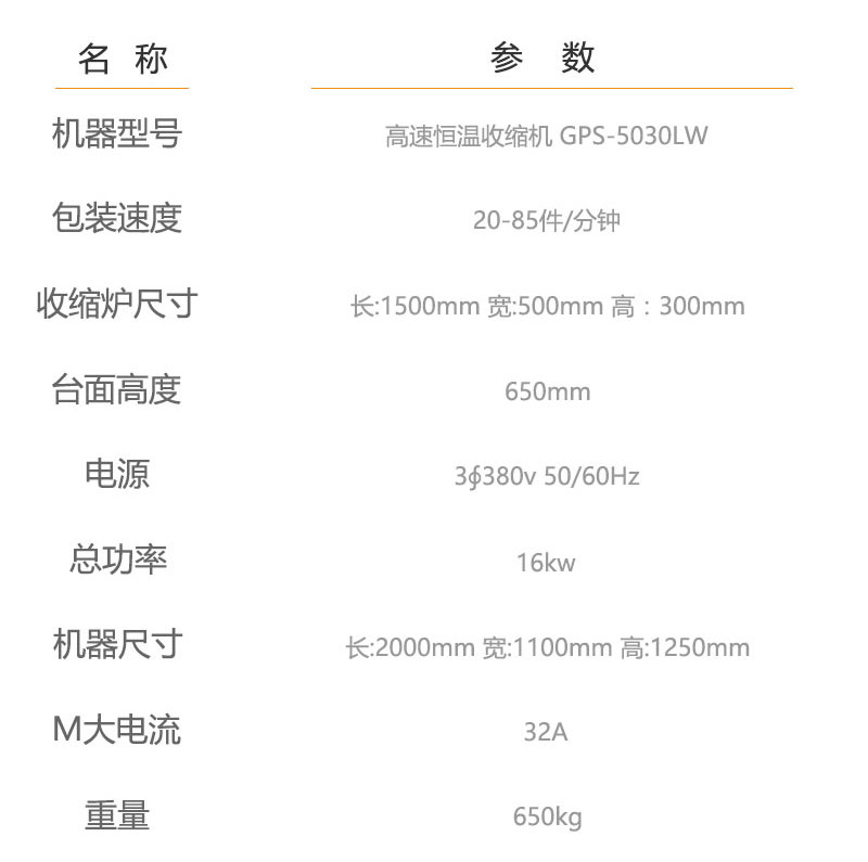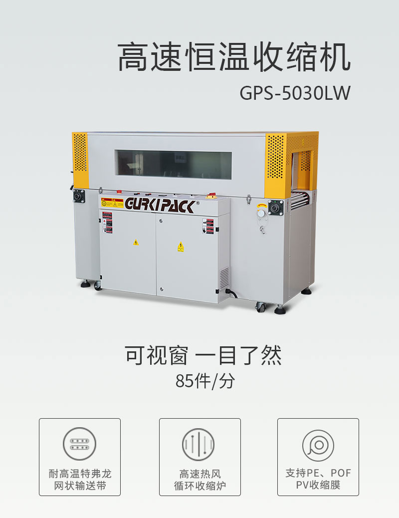 高速恒溫收縮機(jī)GPS-5030LW該機(jī)性價(jià)比高,收縮速度能達(dá)85件/分,操作簡單。可單機(jī)作業(yè),也可與自動(dòng)化包裝流水線配套使用。該款收縮機(jī)適用于餐飲、日化、醫(yī)藥、禮品、工藝品、玩具、五金、機(jī)械等包裝。