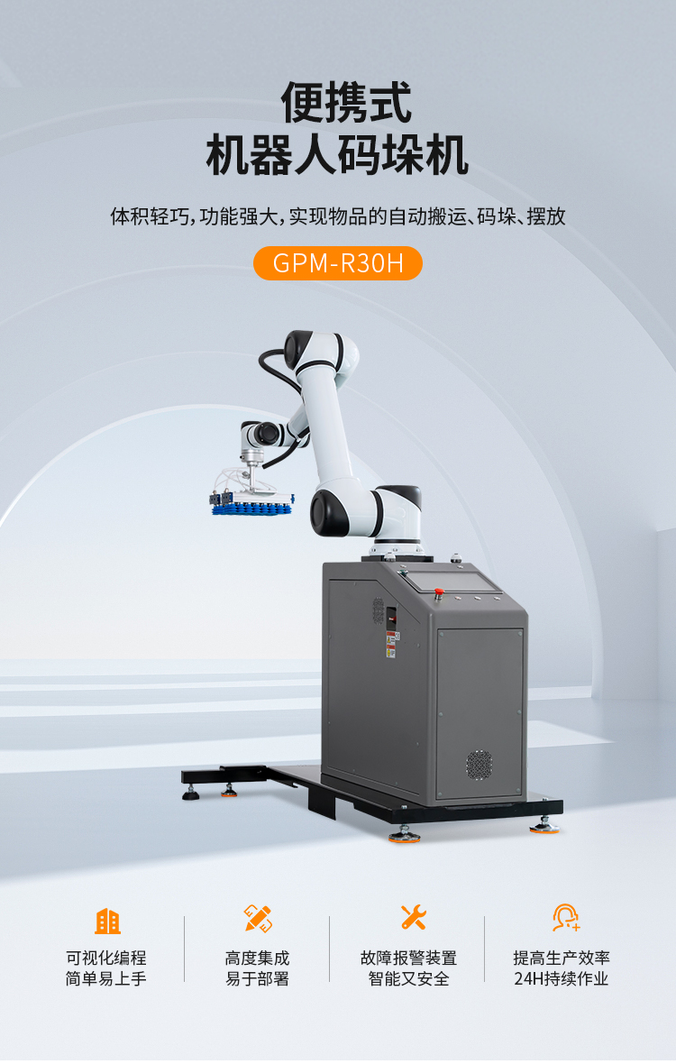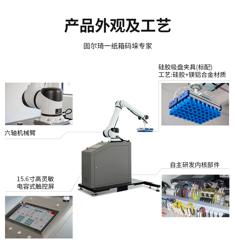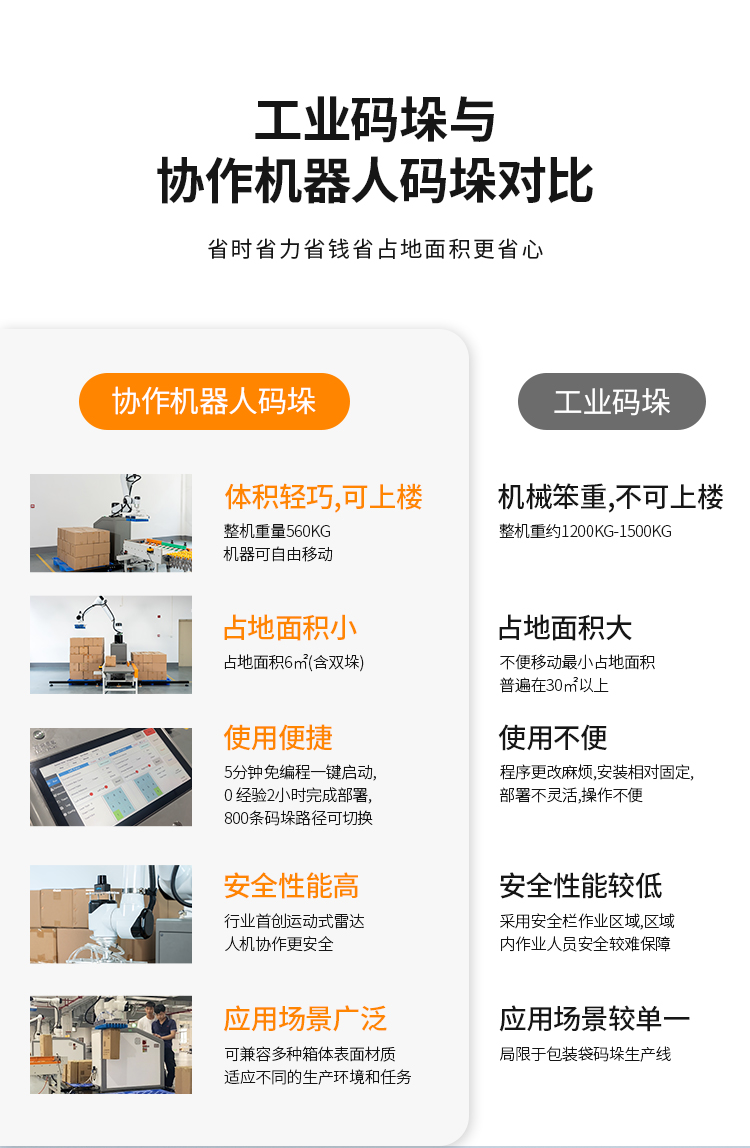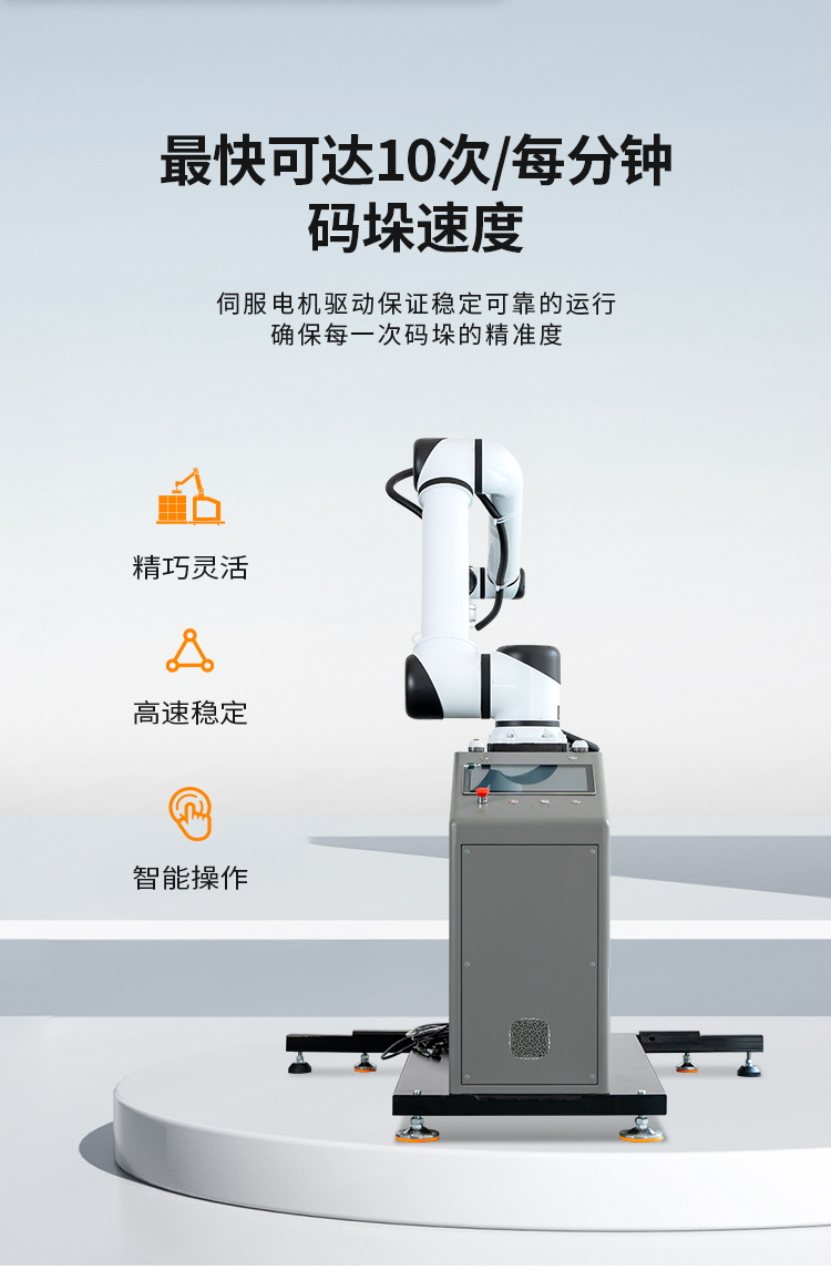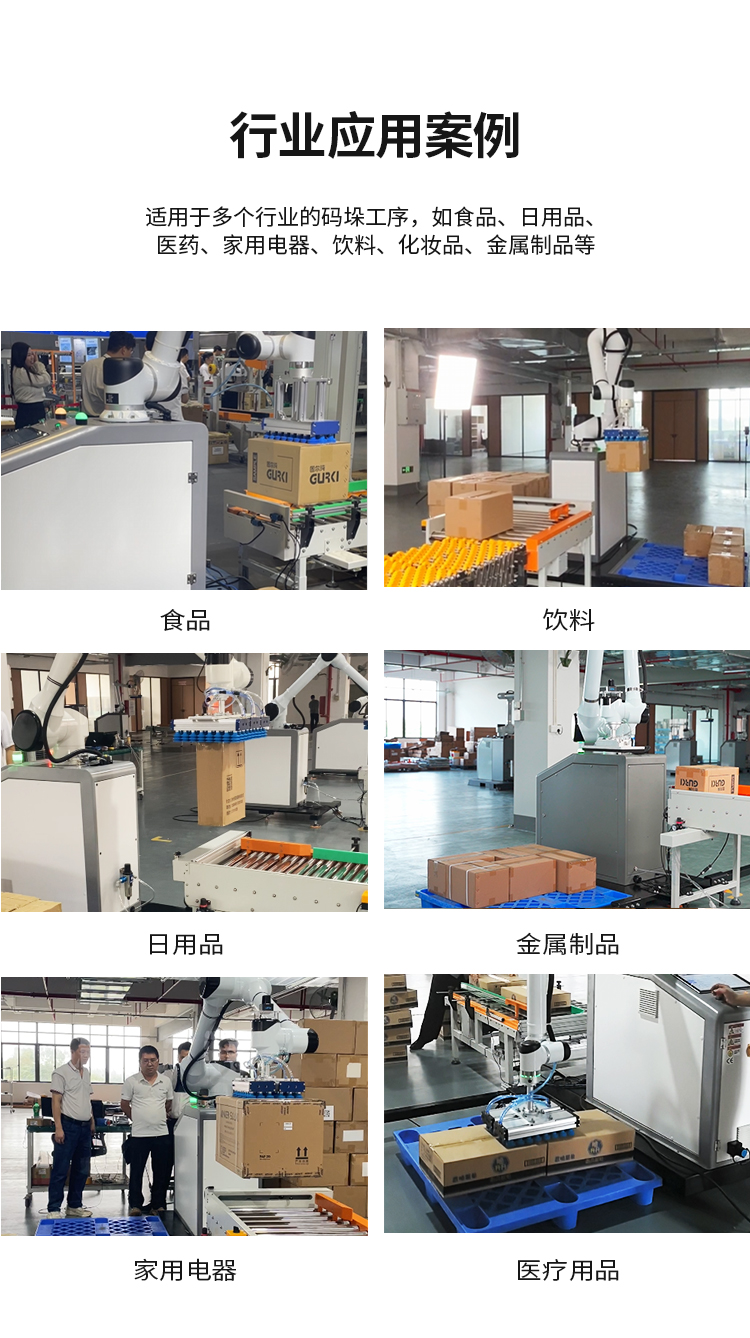 協(xié)作機器人碼垛,與人類工作人員緊密合作,提高生產(chǎn)效率、靈活適應不同任務。安全配備傳感器,為工作人員創(chuàng)造更安全高效的工作環(huán)境,外形精巧美觀,調(diào)整方便簡單,本設(shè)備采用觸控屏操作,實現(xiàn)智能化操作管理,簡便、易掌握??纱蟠蟮販p少勞動人員和降低勞動強度??瑟毩⑹褂靡部膳涮鬃詣庸C和棧板輸送機來實現(xiàn)全自動碼垛系統(tǒng),廣泛應用于多個行業(yè)的碼垛工序,如紙箱類、醫(yī)藥類、日用品、食品、飲料、化妝品、金屬制品等。