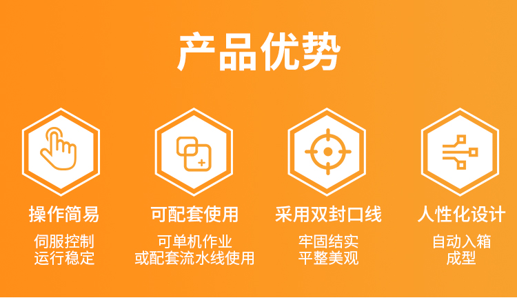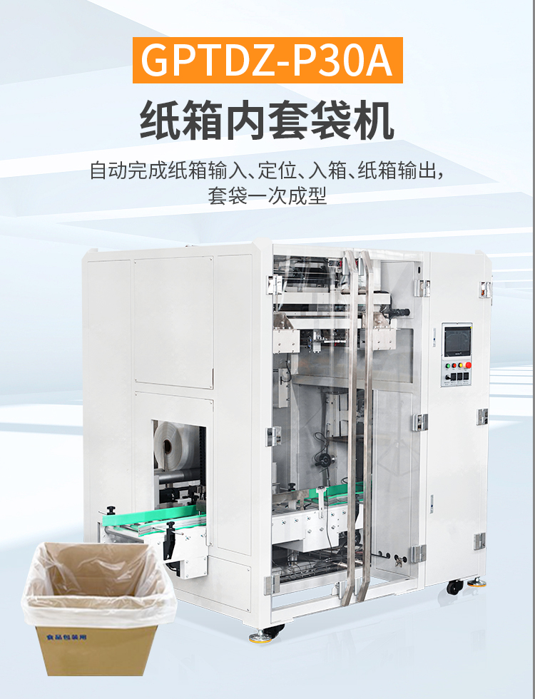 自動(dòng)紙箱內(nèi)套袋機(jī),該機(jī)采用多伺服控制,自動(dòng)完成紙箱輸入、定位、卷膜輸出、入箱、切膜、折邊、紙箱輸出。自動(dòng)套袋一次同步成型,無(wú)需停機(jī),可銜接前段自動(dòng)開(kāi)箱機(jī),后段自動(dòng)裝箱機(jī)、自動(dòng)提袋封口機(jī)和自動(dòng)封箱機(jī)實(shí)現(xiàn)無(wú)人化自動(dòng)包裝。該款套袋機(jī)適用PE膜材質(zhì),運(yùn)用于化工、粉末、固體、半固體或液體;食品,固態(tài)油、油脂、食用油類(lèi)、調(diào)味品、餅干、生鮮水果類(lèi)等產(chǎn)品的內(nèi)套袋包裝。