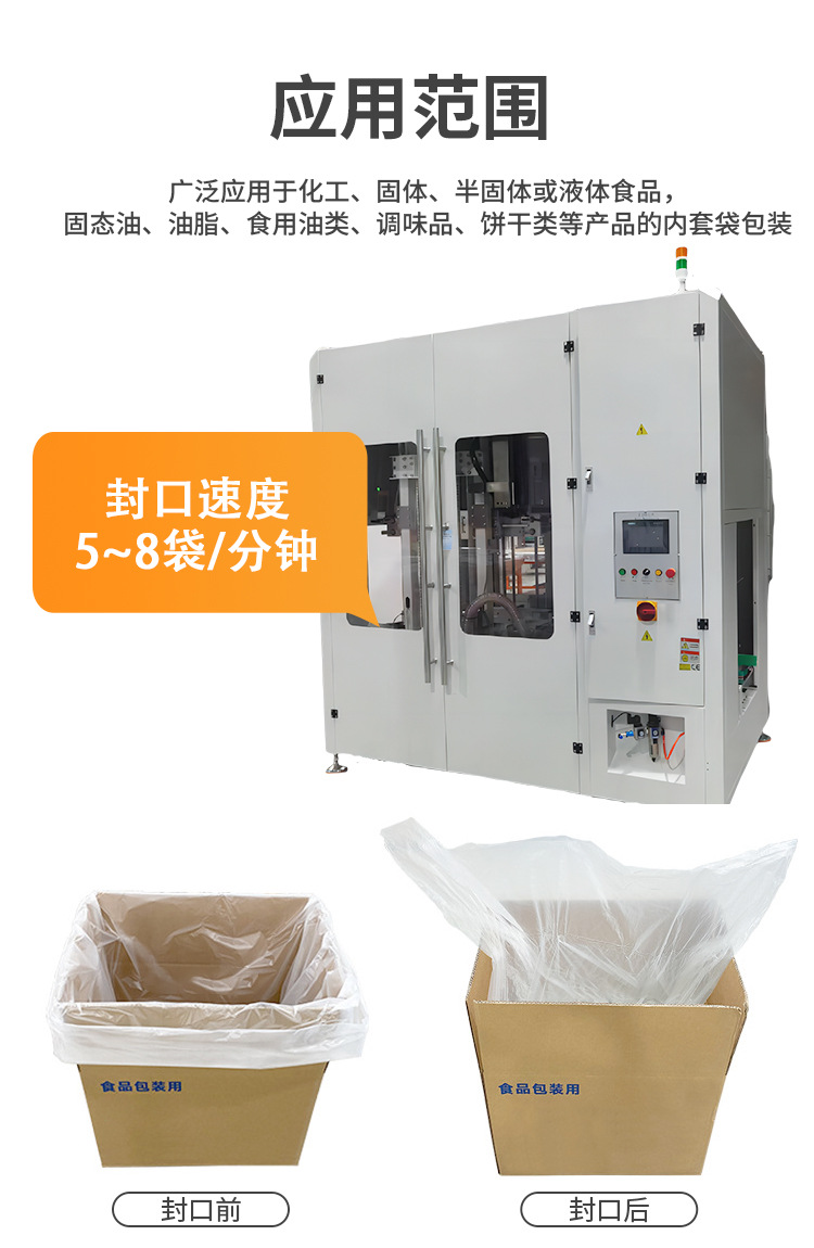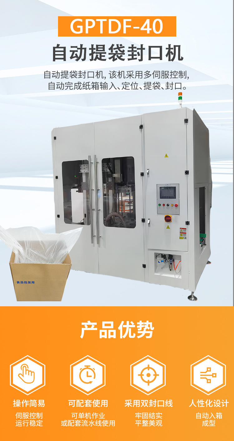 自動(dòng)提袋封口機(jī), 該機(jī)采用多伺服控制, 自動(dòng)完成紙箱輸入、定位、提袋、封口。自動(dòng)提袋封口一次同步成型, 無(wú)需停機(jī), 可銜接前段自動(dòng)紙箱內(nèi)套袋機(jī), 后段自動(dòng)封箱機(jī)、自動(dòng)紙箱內(nèi)套袋和自動(dòng)封箱機(jī)實(shí)現(xiàn)無(wú)人化自動(dòng)包裝。該款提袋封口機(jī)適用P0、PE膜材質(zhì),運(yùn)用于化工、粉末、固體、半固體或液體、食品,固態(tài)油、油脂、食用油類(lèi)、調(diào)味品、餅干、生鮮水果類(lèi)等產(chǎn)品提袋封口作業(yè)。