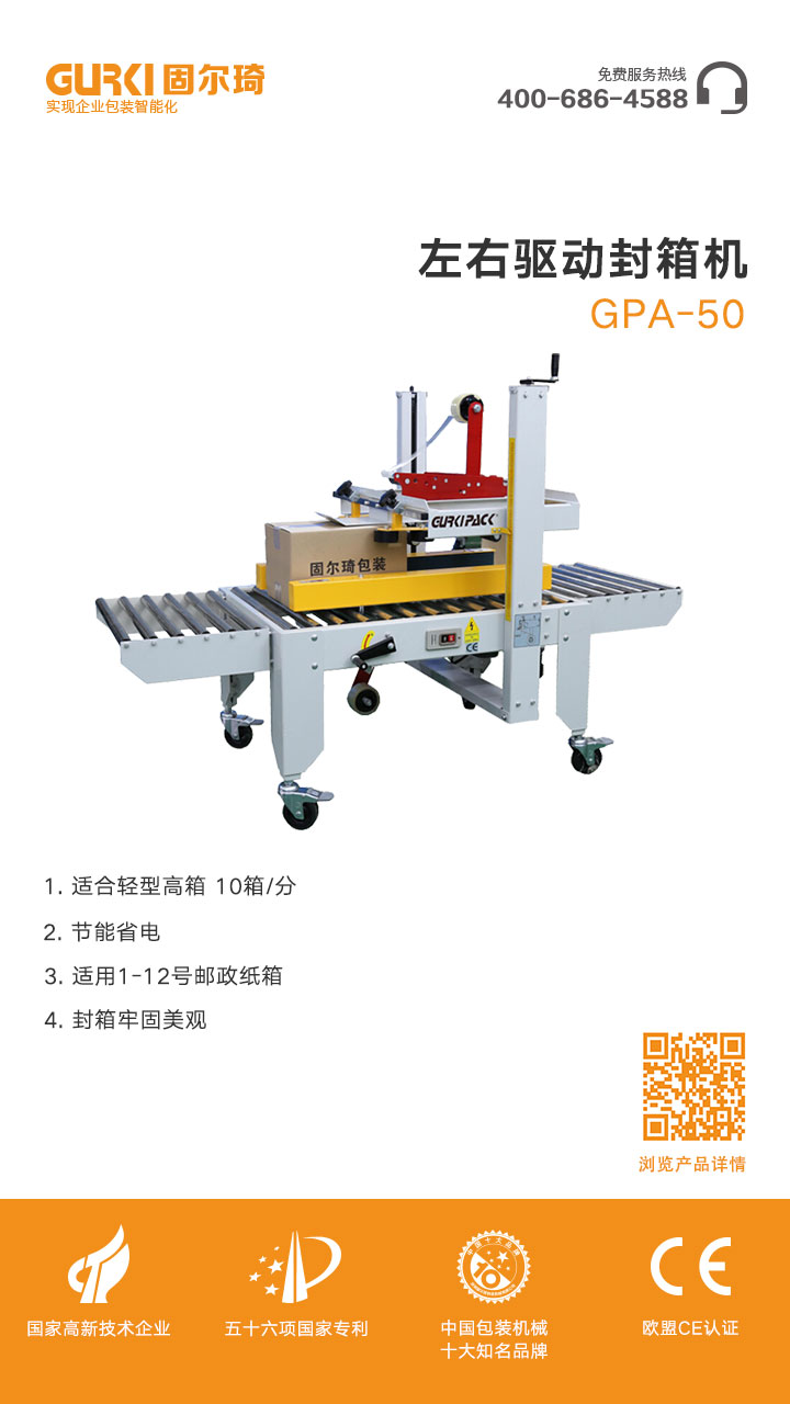 左右驅(qū)動(dòng)封箱機(jī)GPA-50E是兩側(cè)皮帶驅(qū)動(dòng),采用即貼膠帶封口,封箱效果平整??筛鶕?jù)紙箱規(guī)格,手工調(diào)節(jié)寬度與高度,簡(jiǎn)單,快捷,方便 可替代人工,是企業(yè)節(jié)省成本,提高生產(chǎn)效率的理想選擇。該款封箱機(jī)廣泛應(yīng)用于食品、醫(yī)藥、玩具、煙草、日化、電子等行業(yè)。