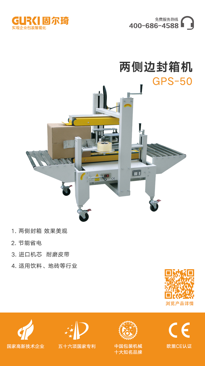 兩側(cè)邊封箱機GPS-50,本封箱機特點就是紙箱側(cè)放,進行兩側(cè)封箱,適 用于側(cè)邊開口的紙箱,如飲料、地磚等。封箱效果平整、規(guī)范、美觀;采用 即貼膠帶封口,經(jīng)濟快速、容易調(diào)整,兩側(cè)邊貼帶封箱一道完成,方便、 快速、穩(wěn)定。