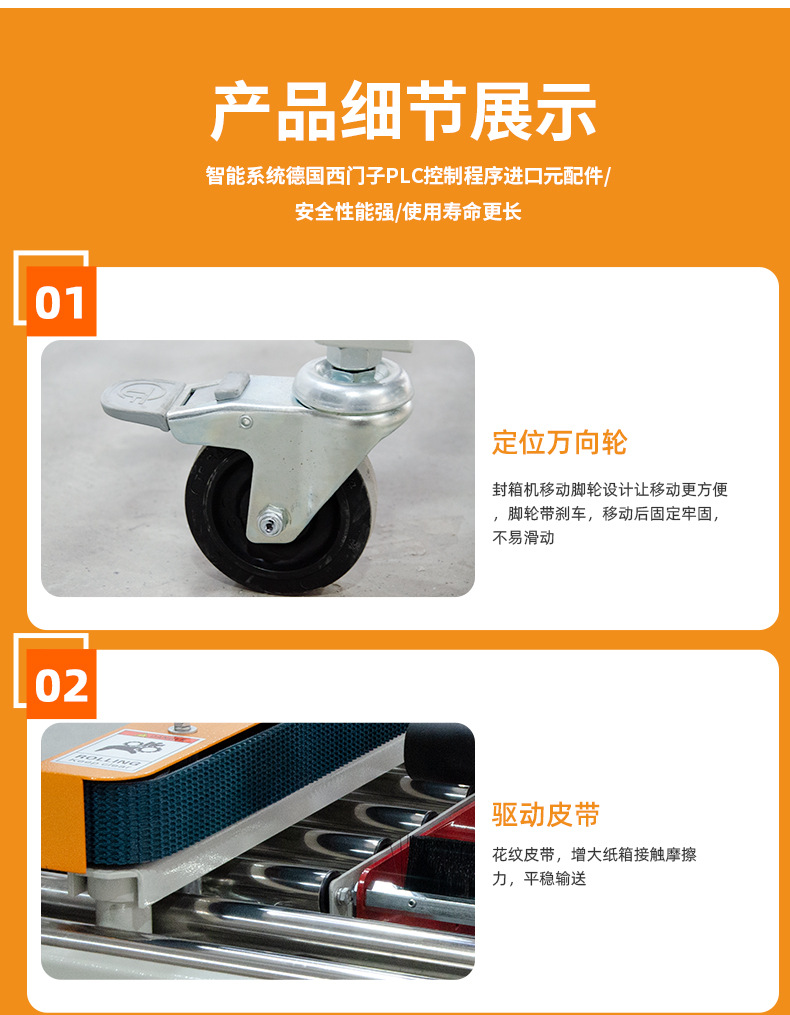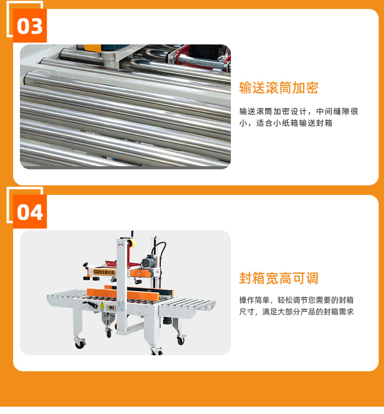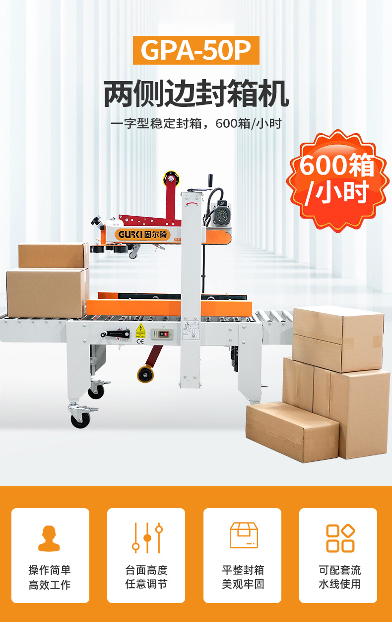 左右+上下驅動封箱機GPA-50P采用即貼膠帶封紙箱封口,經(jīng)濟快速、容 易調整,可一次完成上、下封箱動作,也可以采用印字膠帶,更可提高產 品形象,體積輕巧,滑輪相輔,位移甚為靈活,更加方便安裝與調試。 該款封箱機廣泛應用于食品、醫(yī)藥、玩具、煙草、日化、電子等國內外各 行業(yè)。