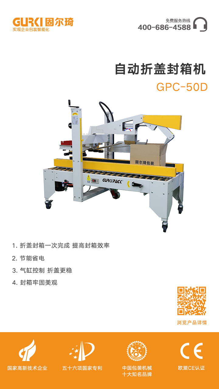 GPC-50D自動折上蓋,上下自動貼上膠帶,無需人手作業(yè);采用即貼膠帶紙箱封口,不僅封箱效果美觀,且封口牢固,配套自動化包裝流水線使用將更能體現(xiàn)此機價值。該款封箱機廣泛應(yīng)用于食品、醫(yī)藥、飲料、煙草、日化、汽車、線纜、電子等行業(yè)。