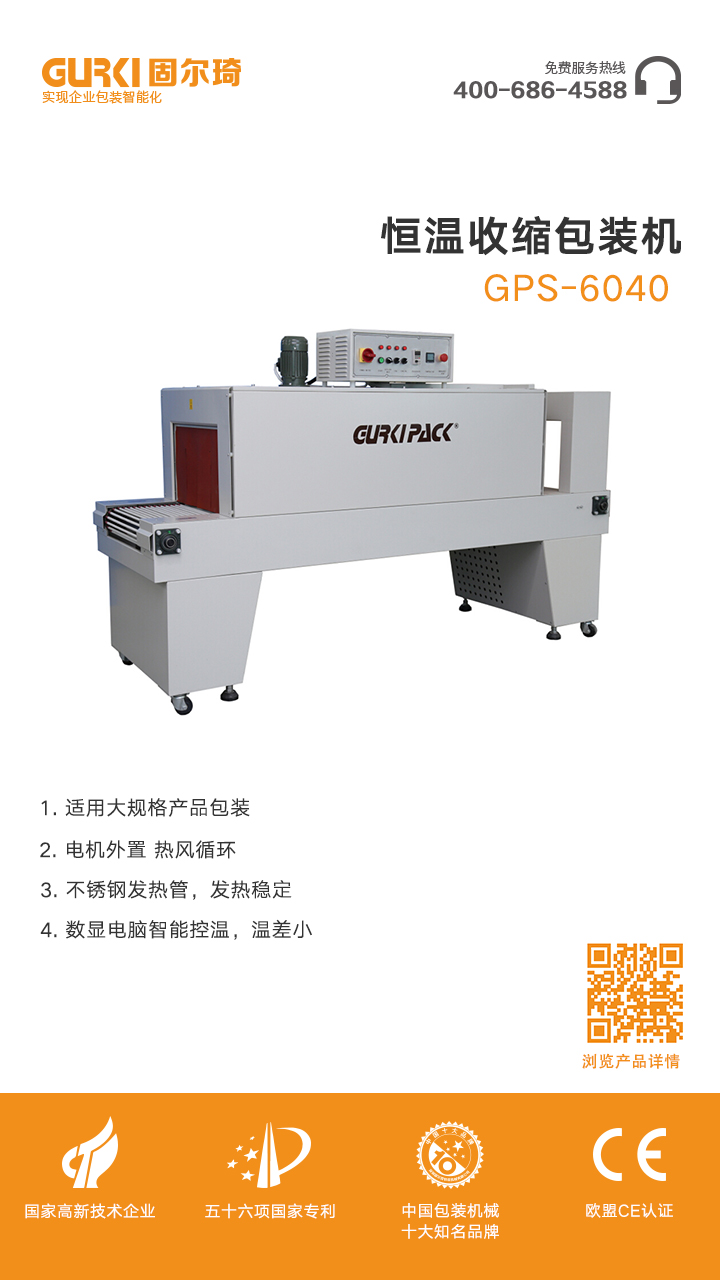 恒溫收縮包裝機GPS-6040采用內(nèi)循環(huán)風(fēng)道設(shè)計,保證爐內(nèi)溫度均勻;不銹鋼發(fā)熱管,發(fā)熱穩(wěn)定,使用壽命長;輸送滾軸的外部包配有耐高溫硅膠管,使用壽命長。包裝速度為20-80件/分。該款收縮包裝機適用于食品、醫(yī)藥、飲料、煙草、日化、汽車、線纜、化妝品、電子等行業(yè)。